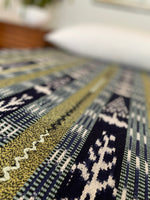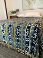 Handmade by Carmen. Organic cotton threads naturally dyed with the baccharis plant, indigo, and the sacatinta plant, The sacatina plant was harvested on both full and new moon adding to the beautiful greens in this blanket! Handwoven patterns of the local cacao and corn crops.